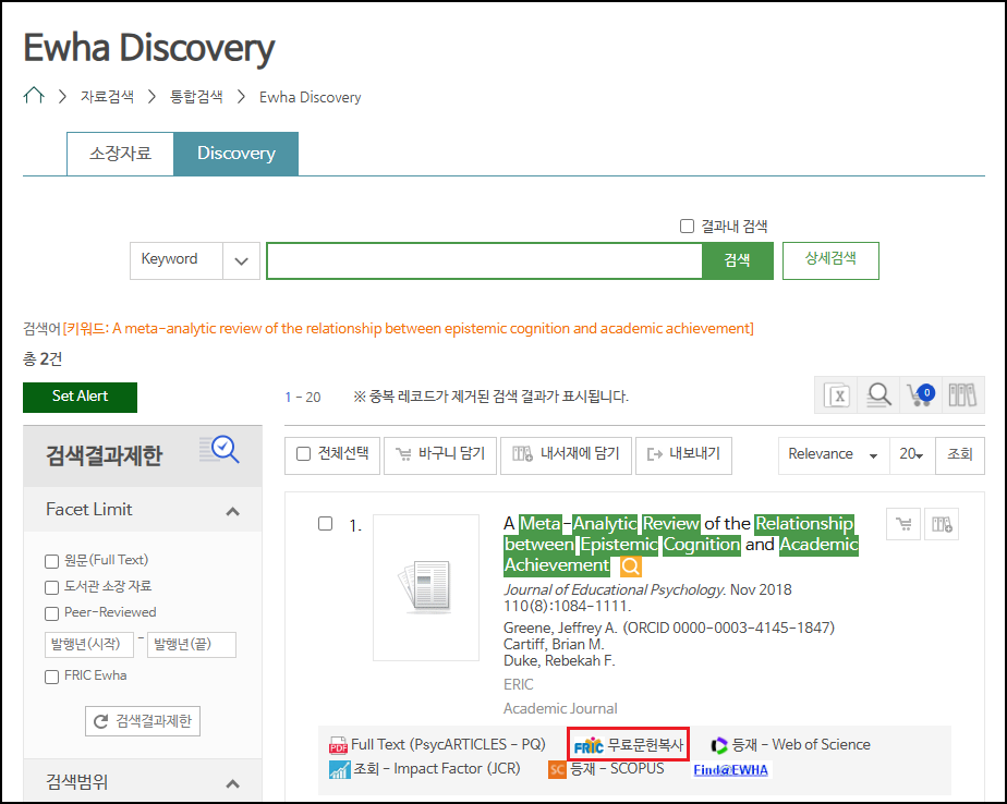 이화여자대학교 소속 이용자는 도서관 홈페이지를 통해 원문복사서비스를 신청할 수 있습니다.